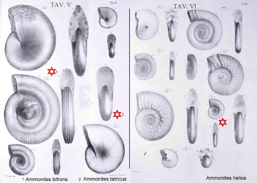 Vedi sotto: Ammonites tatricus, tav. V, fig. 2 a-b; Ammonites bifrons tav. V, fig. 3 a-b; Ammonites helius, tav. 6 fig. 6