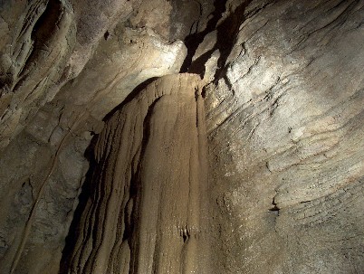 Al suo interno colpisce il grande sviluppo in altezza della concrezione citata da Antonio Stoppani, come esempio, nelle " Note per un corso annuale di Geologia" (1866). "Vi sarà occorso, per esempio, di osservare come una goccia aderendo ad una superficie che presenti un piano inclinato, vi scorra segnando una striscia più o men tortuosa. Nel nostro caso la striscia è segnata da una incrostazione che a poco a poco forma un lembo saliente, che si accresce e si allunga. Ecco l'origine delle magnifiche stalattiti panniformi. Un bellissimo esempio ne vidi nella Grotta del Corno sopra Entratico. Una specie di padiglione o di ricca cortina raccolta cade entro un antro appartato dell'altezza di 7 ad 8 metri, e si diffonde in morbidissimo strascico sul suolo".